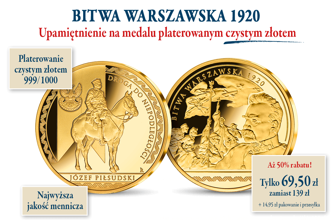 Wspaniałe zwycięstwo upamiętnia medal "Bitwa Warszawska 1920" platerowany czystym złotem (próba 999/1000), wybity w najwyższej jakości menniczej - stemplem lustrzanym.
