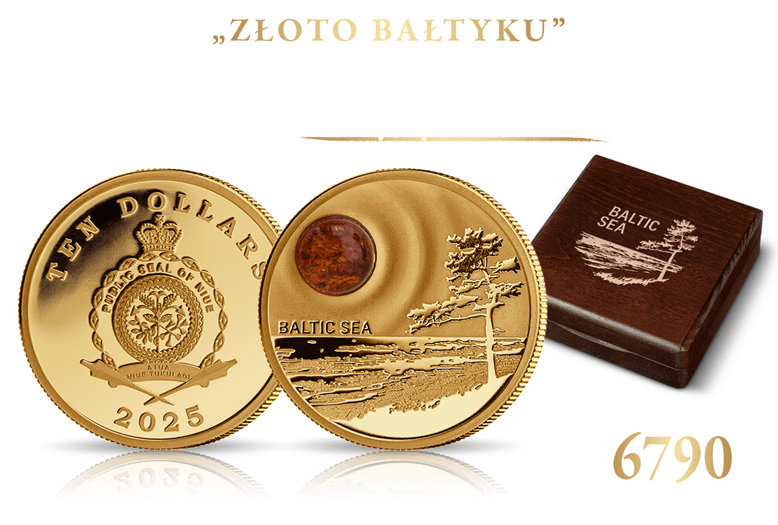 Tak, zamawiam złotą monetę z bursztynem "Złoto Bałtyku" wraz z pudełkiem kolekcjonerskim i numerowanym Certyfikatem Autentyczności w cenie 6790 zł (+ 25 zł koszt pakowania i przesyłki kurierskiej). Zamówienie obejmuje tylko opisaną monetę. Dostawa odbędzie się najpóźniej w ciągu 30 dni od daty przyjęcia oferty. Numizmat zostanie wysłany w stanie menniczym.