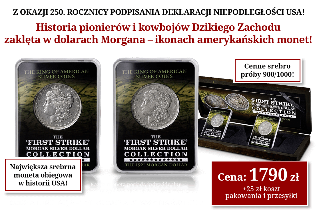 Tak, zamawiam zestaw srebrnych monet "Dolary Morgana" wraz z pudełkiem kolekcjonerskim i Certyfikatami Autentyczności w cenie 1790 zł ( +25 zł koszt pakowania i przesyłki kurierskiej). Zamówienie obejmuje tylko opisane monety. Dostawa odbędzie się najpóźniej w ciągu 30 dni od daty przyjęcia oferty. Numizmaty zostaną wysłane w bardzo pięknym stanie zachowania.