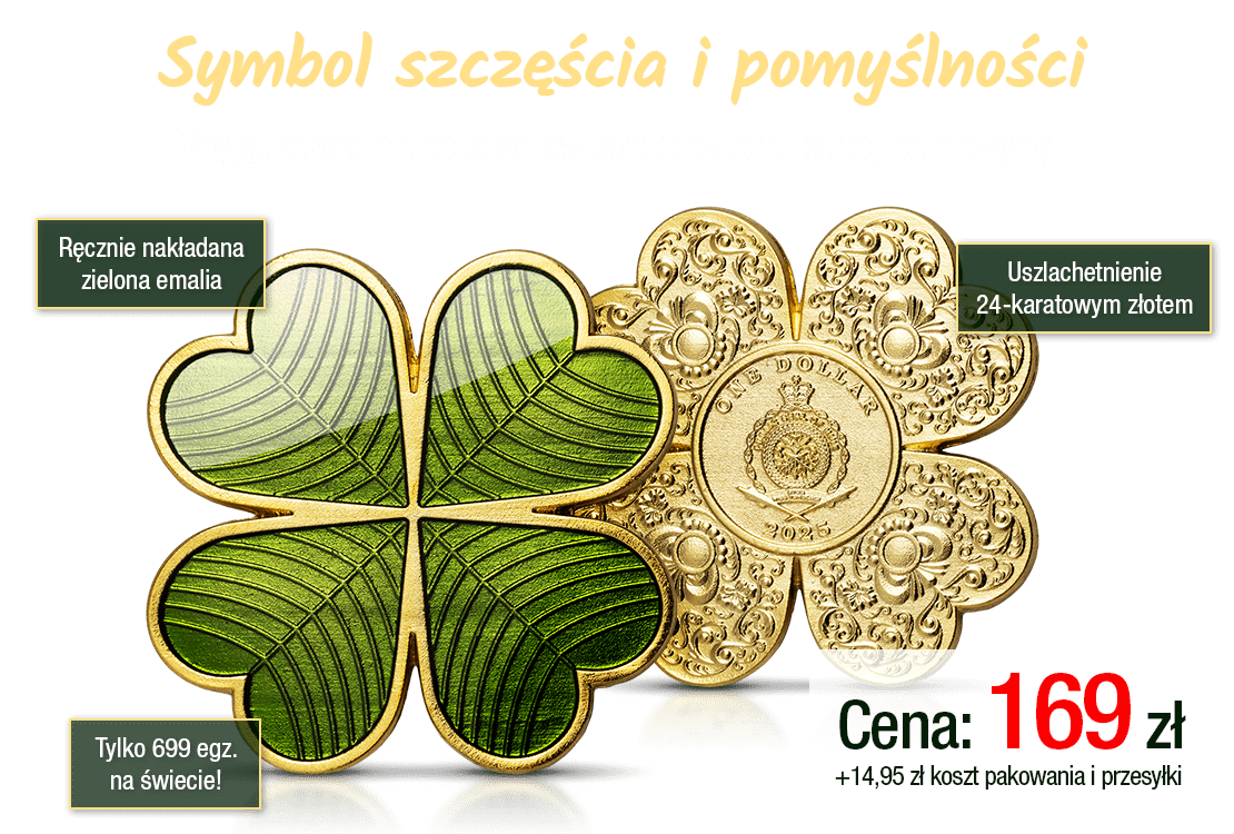 Tak, zamawiam uszlachetnioną złotem i ozdobioną zieloną emalią monetę w kształcie czterolistnej koniczyny wraz z pudełkiem kolekcjonerskim i Certyfikatem Autentyczności w cenie 169 zł (+14,95 zł koszt pakowania i przesyłki). Zamówienie obejmuje tylko opisaną monetę. Dostawa odbędzie się najpóźniej w ciągu 30 dni od daty przyjęcia oferty. Numizmat zostanie wysłany w stanie menniczym.