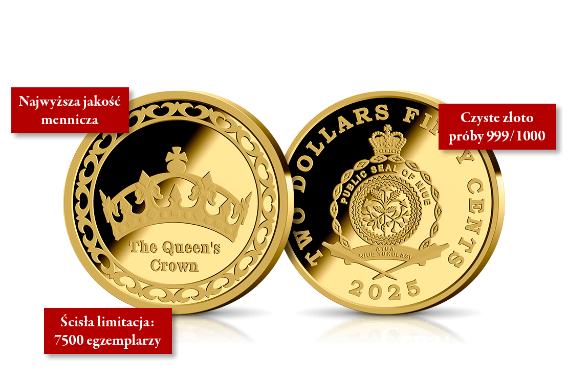 Tak, zamawiam złotą monetę o masie 0,65 g "Korona królowych" wraz z Certyfikatem Autentyczności w cenie 950 zł (+14,95 zł koszt pakowania i przesyłki). Zamówienie obejmuje tylko opisaną monetę. Dostawa odbędzie się najpóźniej w ciągu 30 dni od daty przyjęcia oferty. Numizmat zostanie wysłany w stanie menniczym.
