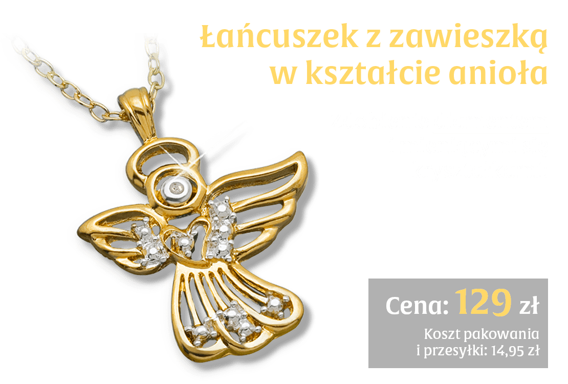 Tak, zamawiam łańcuszek i zawieszkę w kształcie anioła ozdobioną diamentem i kryształkami w cenie 129 zł (+14,95 zł koszt pakowania i przesyłki). Zamówienie obejmuje tylko opisany produkt. Dostawa odbędzie się najpóźniej w ciągu 30 dni od daty przyjęcia oferty.
