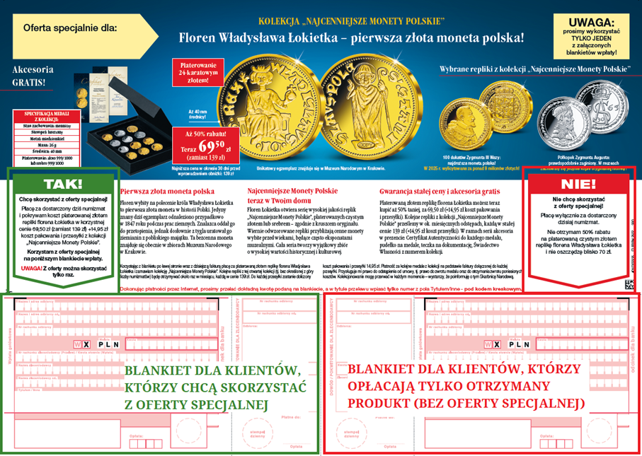 Blankiet po lewej stronie (wyższa kwota) pozwala opłacić zamówienie i skorzystać z oferty specjalnej. Państwa wpłata będzie już zamówieniem - nie trzeba odsyłać osobnego kuponu.