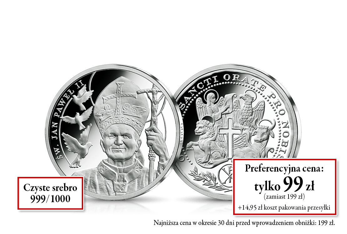 Upamiętnieniem kanonizacji Ojca Świętego jest pierwsza pamiątkowa emisja wybita w czystym srebrze 999/1000, w najwyższej jakości menniczej – stemplem lustrzanym.