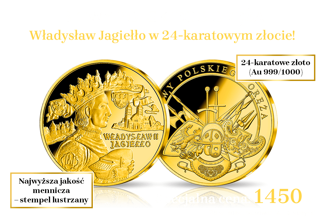 Tak, zamawiam złoty medal o masie 1,2 g „Władysław Jagiełło” wraz z Certyfikatem Autentyczności w cenie 1450 zł (+ 25 zł koszt pakowania i przesyłki). Zamówienie obejmuje tylko opisany medal. Dostawa odbędzie się najpóźniej w ciągu 30 dni od daty przyjęcia oferty. Numizmat zostanie wysłany w stanie menniczym.